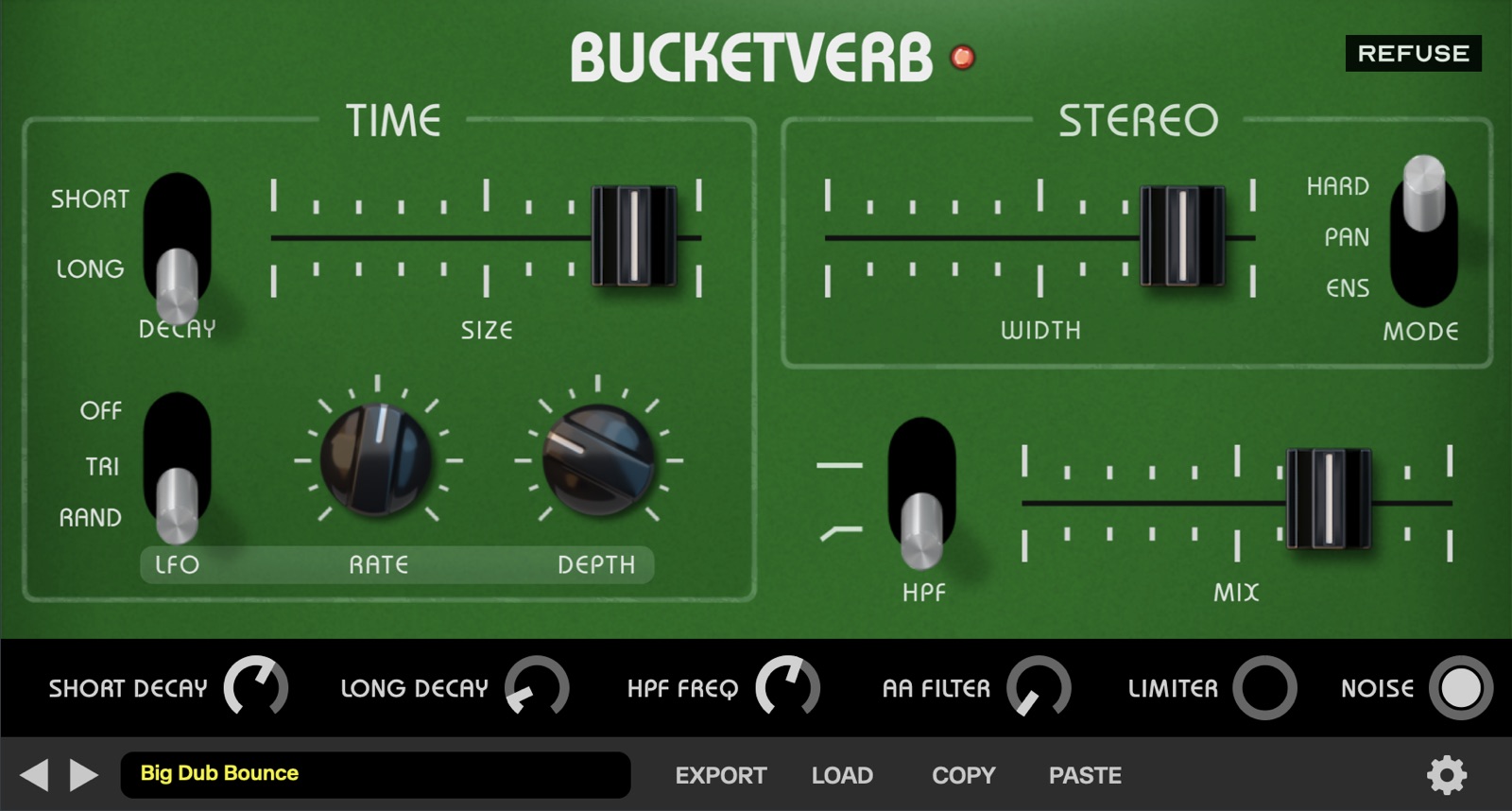 Bucketverb also features several enhancements which were never available on hardware units made with the MN3011 BBD chip. An LFO – offering triangle or random waveforms – allows for modulation of the delay time, and is perfect for getting subtle decayed sounds (dub guitars, synthwave/vaporwave synths) or wild, analog glitch-style effects.