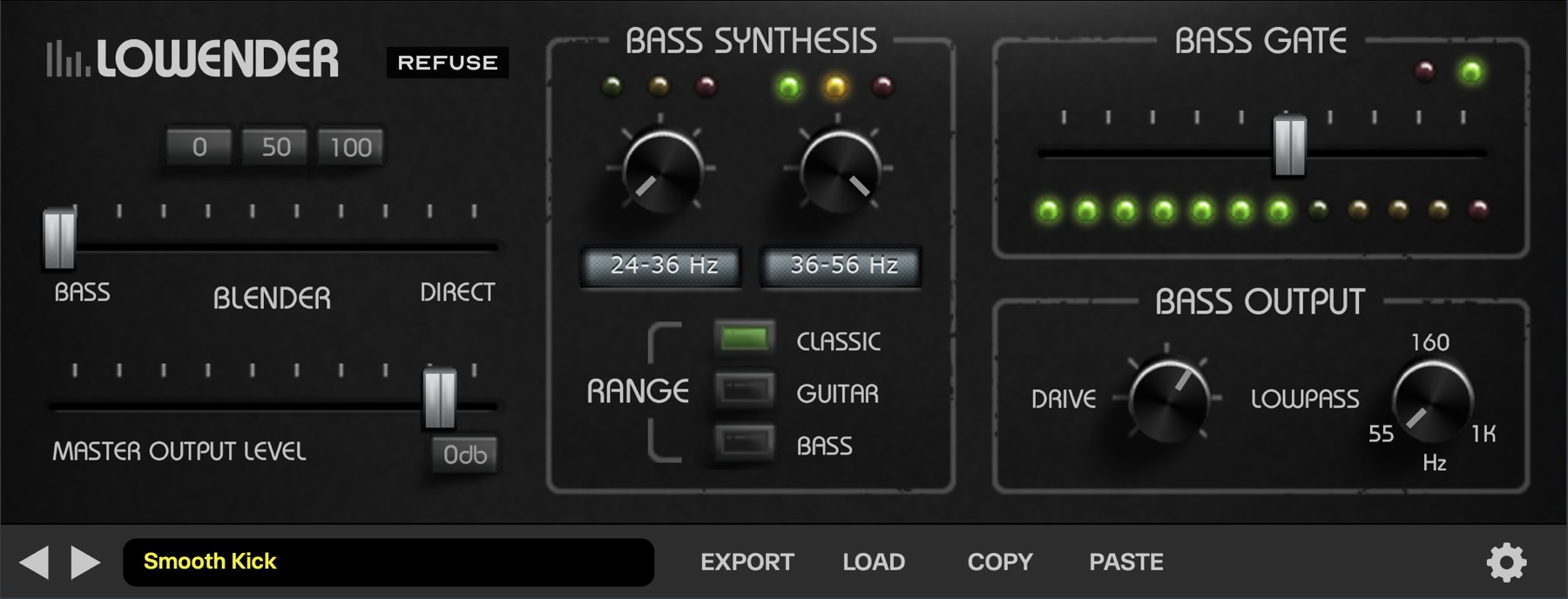 Third, the Lowender passes the bass material through an output section comprised of an overdrive circuit and a lowpass filter. Driving or compressing the newly generated low frequencies is essential for evening out their dynamics, and will allow them to sit well in a mix. The variable lowpass filter is provided to shave off the higher harmonics of the overdrive and create a smooth low end - or you can leave some of them in, for raspier bass sounds.